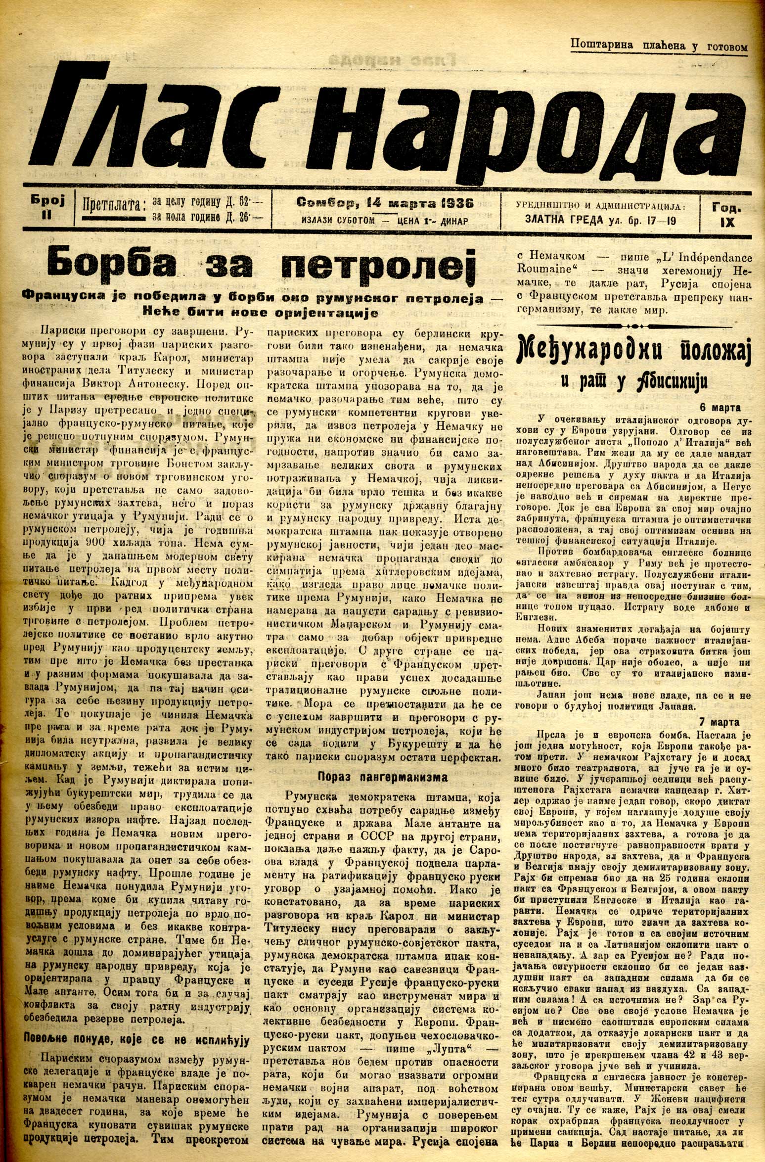Datum izdavanja: 14. 3. 1936. , Broj: 11